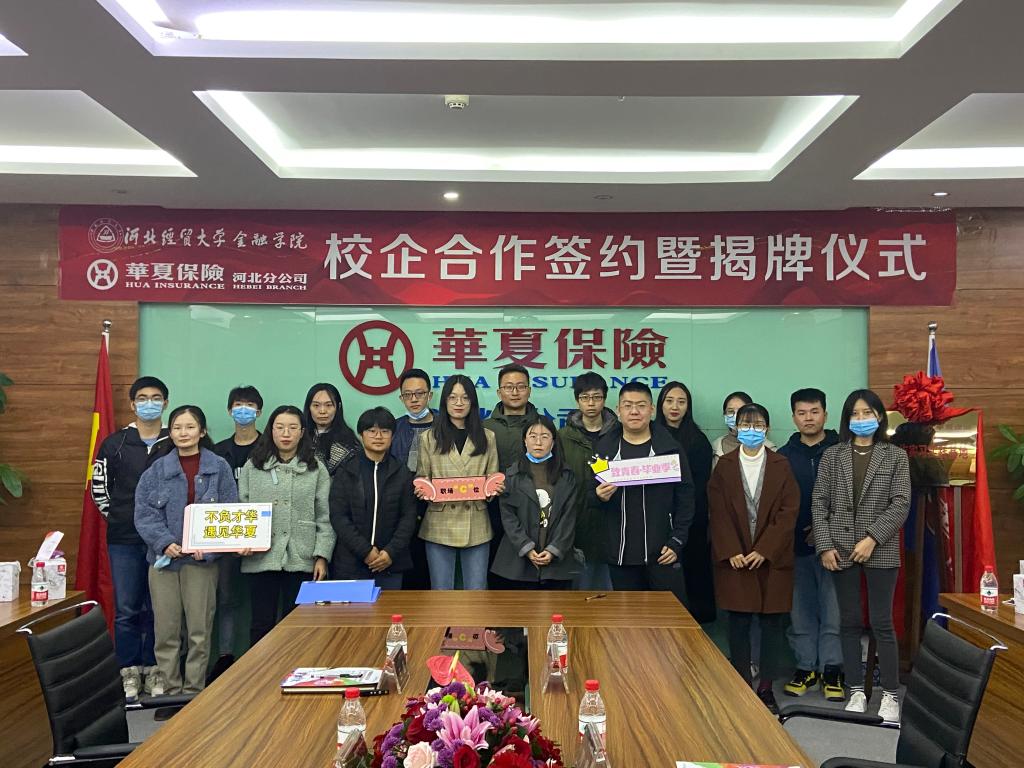 11月4日上午,william威廉中文官网在华夏人寿保险股份有限公司河北分公司会议室举行“校企合作签约暨揭牌仪式”。出席签约仪式的嘉宾有华夏保险河北分公司总经理助理侯丽芳、组织人事处经理王园。william威廉中文官网副经理刘颖,副经理杨雪美,团队建设办公室主任、研究生辅导员董岚及20名保险、金融专业在校研究生参加签约揭牌仪式。仪式由组织人事处董青主持。