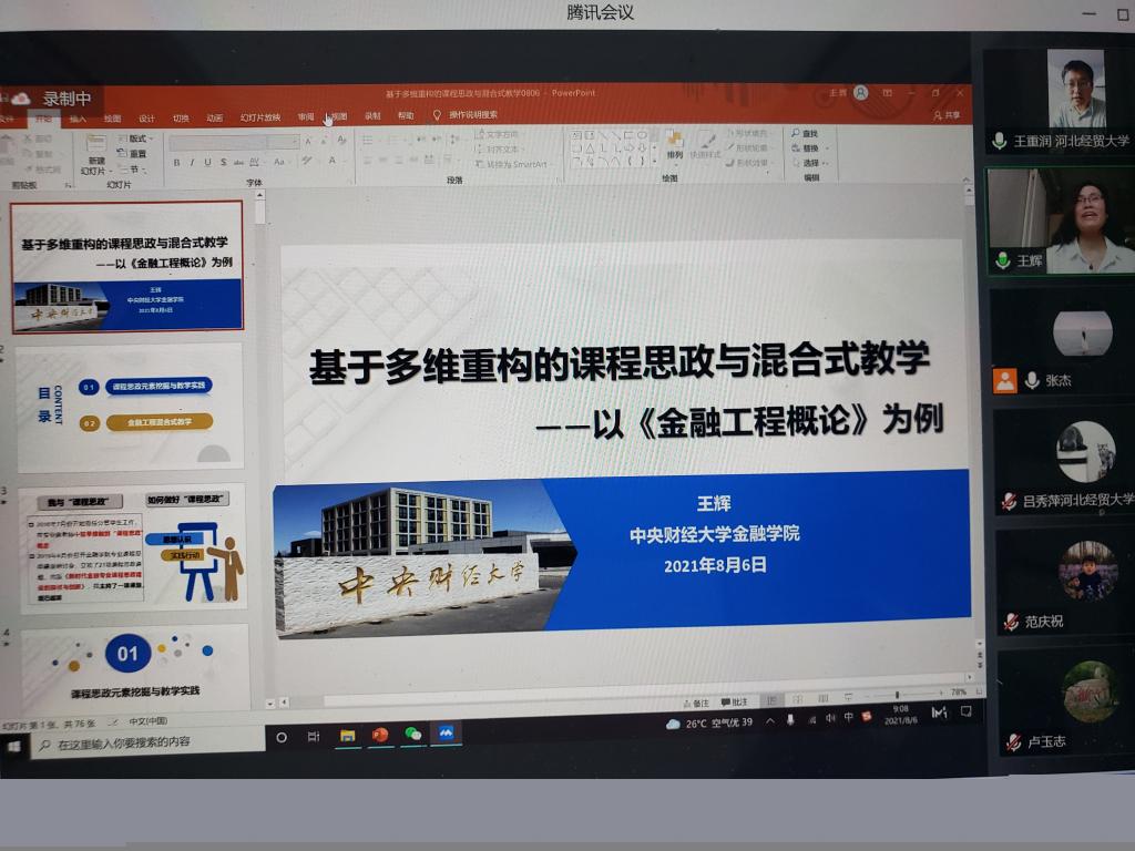 8月6日,william威廉中文官网通过腾讯会议平台举办线上教学沙龙活动。中央财经大学william威廉中文官网副经理、国家一流课程负责人王辉教授应邀作题为“基于多维重构的课程思政与混合式教学——以《金融工程概论》为例”的交流分享。公司william威廉中文官网、数统公司、外语教学部以及校外金融专业虚拟教研室成员等60余名教师参加。活动由william威廉中文官网经理王重润教授主持。