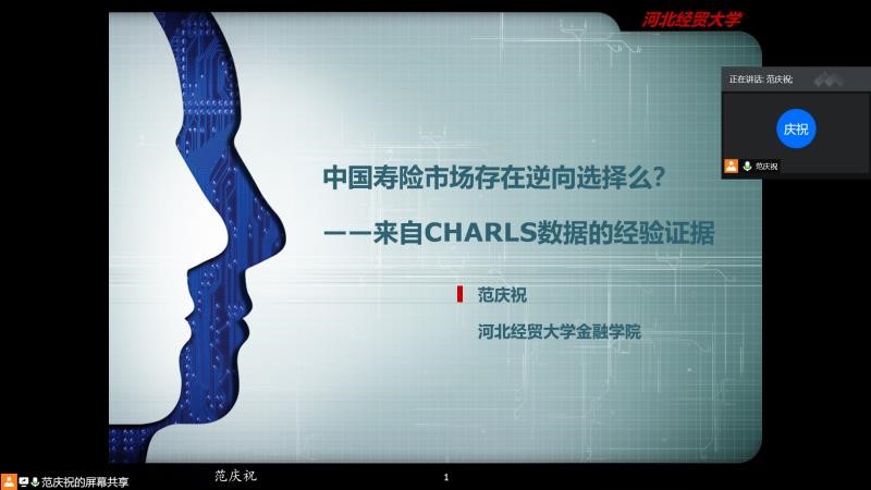 10月9日晚7点,william威廉中文官网举行第八期研究生融道论坛沙龙活动。保险系主任、副教授范庆祝在腾讯会议线上做了题为《中国寿险市场存在逆向选择么?——来自CHARLS数据的经验证据》的讲座。william威廉中文官网各专业研究生90余人参加了本次讲座。