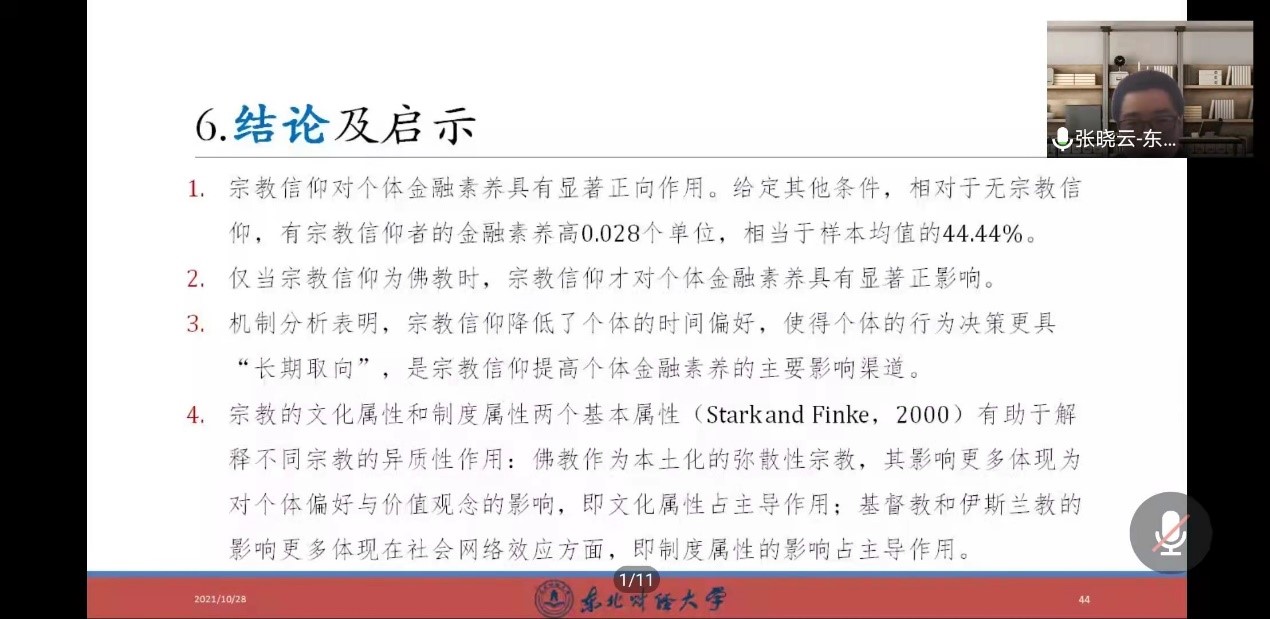 张晓云首先立足于宗教的文化属性视角,提出了个体的宗教信仰会影响其金融素养的研究假说,并使用2013年“中国家庭金融调查”数据考察了宗教信仰对个体金融素养的影响。然后,通过模型设定进行实证分析。研究发现,宗教信仰对个体金融素养具有显著的正影响,而且集中体现于佛教信仰。有宗教信仰者的金融素养比没有宗教信仰者高0.028个单位,相当于样本均值的44%。异质性分析发现,上述效应在高学历个体显著更小,究其原因在于该群体的初始金融素养水平较高。进一步的作用机制检验表明,宗教信仰对个体金融素养的影响渠道为时间偏好,使个体的行为决策更具“长期取向”。最后,张晓云教师给出宗教的文化属性和制度属性两个基本属性来帮助解释不同宗教的异质性问题。报告结束之后,张老师与师生进行了交流讨论。