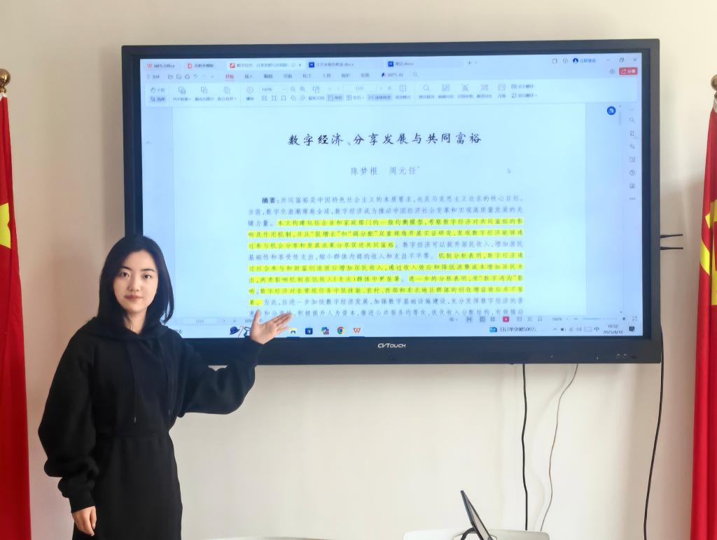张紫清对该论文进行了详细解读,阐述了研究背景、方法与结论。研究发现,数字经济能够通过提升居民收入、缩小群体内部不平等来促进共同富裕,但数字鸿沟对部分群体的创收增益效应产生了阻碍,因此建议加快数字经济发展,优化收入分配,提升人力资本,以充分发挥数字经济的普惠性。张紫清的讲解清晰明了,引发了在场师生的热烈讨论。随后范经理也对同学们的科研提出了建议,强调在研究过程中要注重理论与实践相结合,关注社会热点问题,提升研究的针对性和实用性。他还鼓励同学们积极参与学术交流,拓宽视野,提升科研能力。